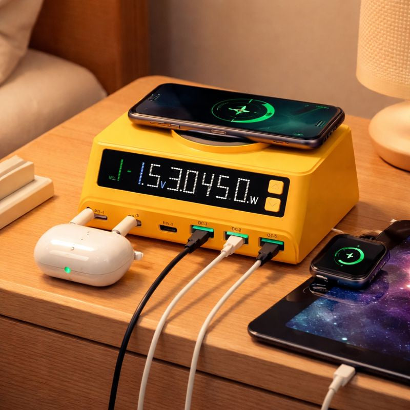Statie de incarcare smart M9A, conceputa pentru alimentarea rapida si sigura a mai multor dispozitive simultan. Cu o putere totala de pana la 110W, aceasta este ideala pentru birou, acasa sau spatii comerciale, oferind incarcare prin cablu si wireless intr-un singur dispozitiv compact.
