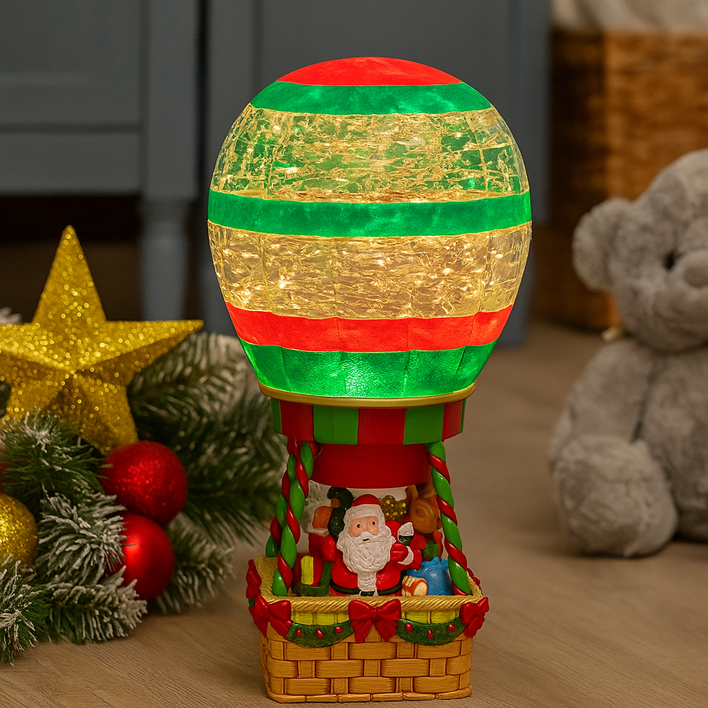Adauga un strop de magie decorului tau de sarbatoare cu aceasta decoratiune de Craciun in forma de balon cu aer cald, avandu-l pe Mos Craciun pregatit de o calatorie festiva pentru a aduce daruri tuturor. Iluminarea calda cu LED ofera un efect vizual spectaculos, transformand orice colt al casei intr-o scena de poveste.
