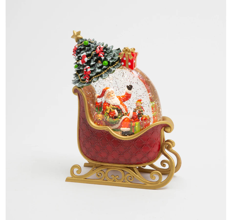 Traieste magia sarbatorilor cu aceasta lampa decorativa de Craciun – Santa’s Sled Lighted Water Lantern, o piesa spectaculoasa care surprinde perfect spiritul Craciunului. In interior se afla Mos Craciun si un spiridus, intr-o sanie plina de cadouri si jucarii, alaturi de un brad impodobit cu stea aurie.