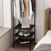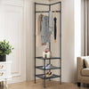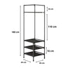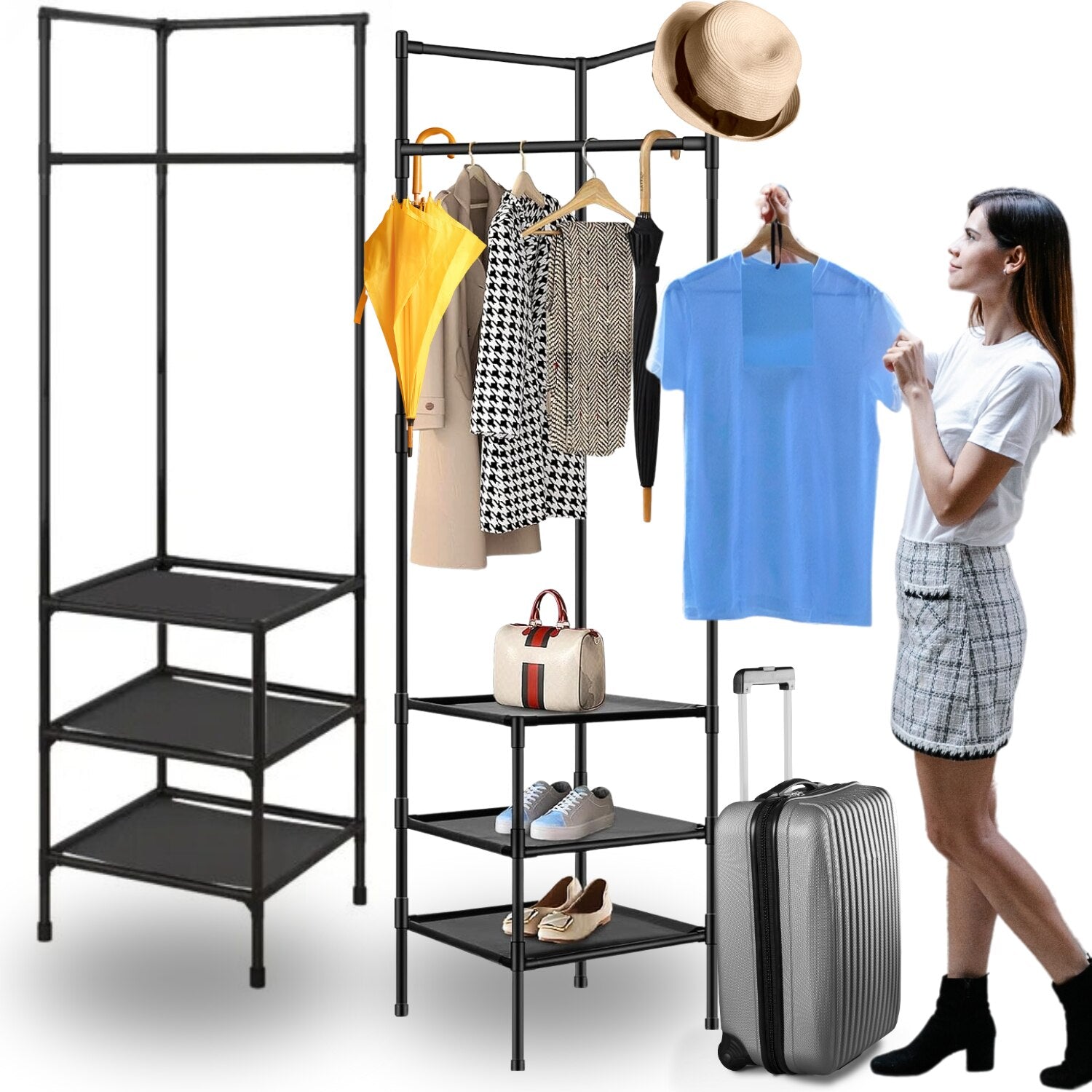 Acest dulap de colt este creat special pentru a maximiza spatiul disponibil. Bara superioara permite depozitarea hainelor pe umerase, iar cele trei rafturi inferioare sunt perfecte pentru incaltaminte, cutii sau alte accesorii. Datorita cadrului metalic, dulapul este stabil si rezistent, iar designul deschis ofera acces rapid la toate obiectele depozitate.