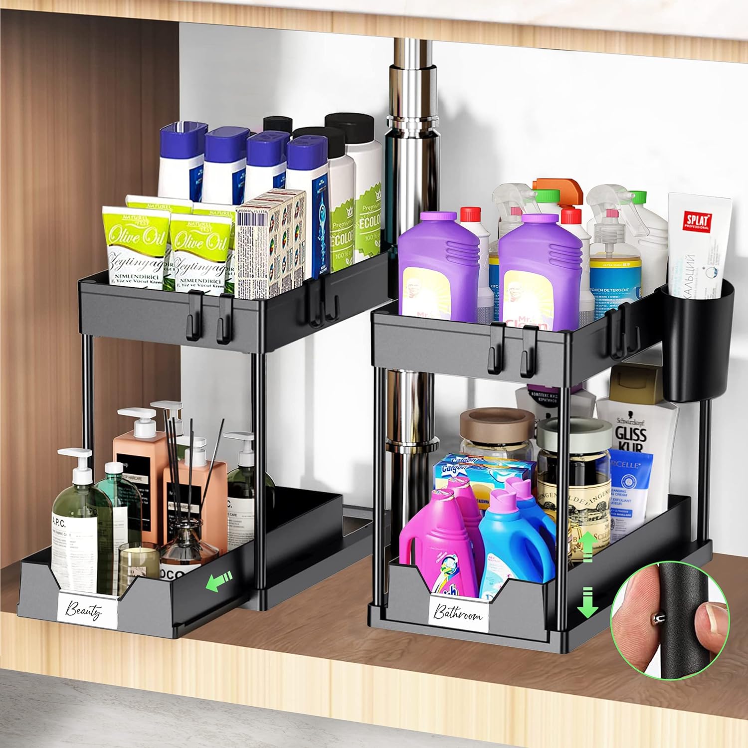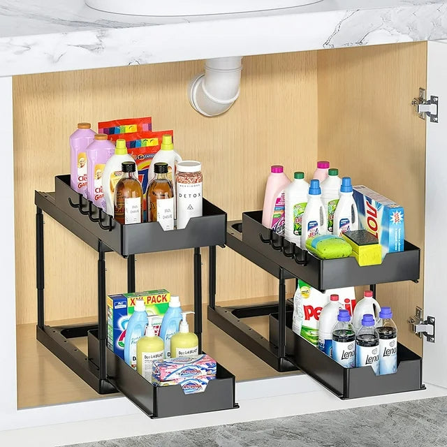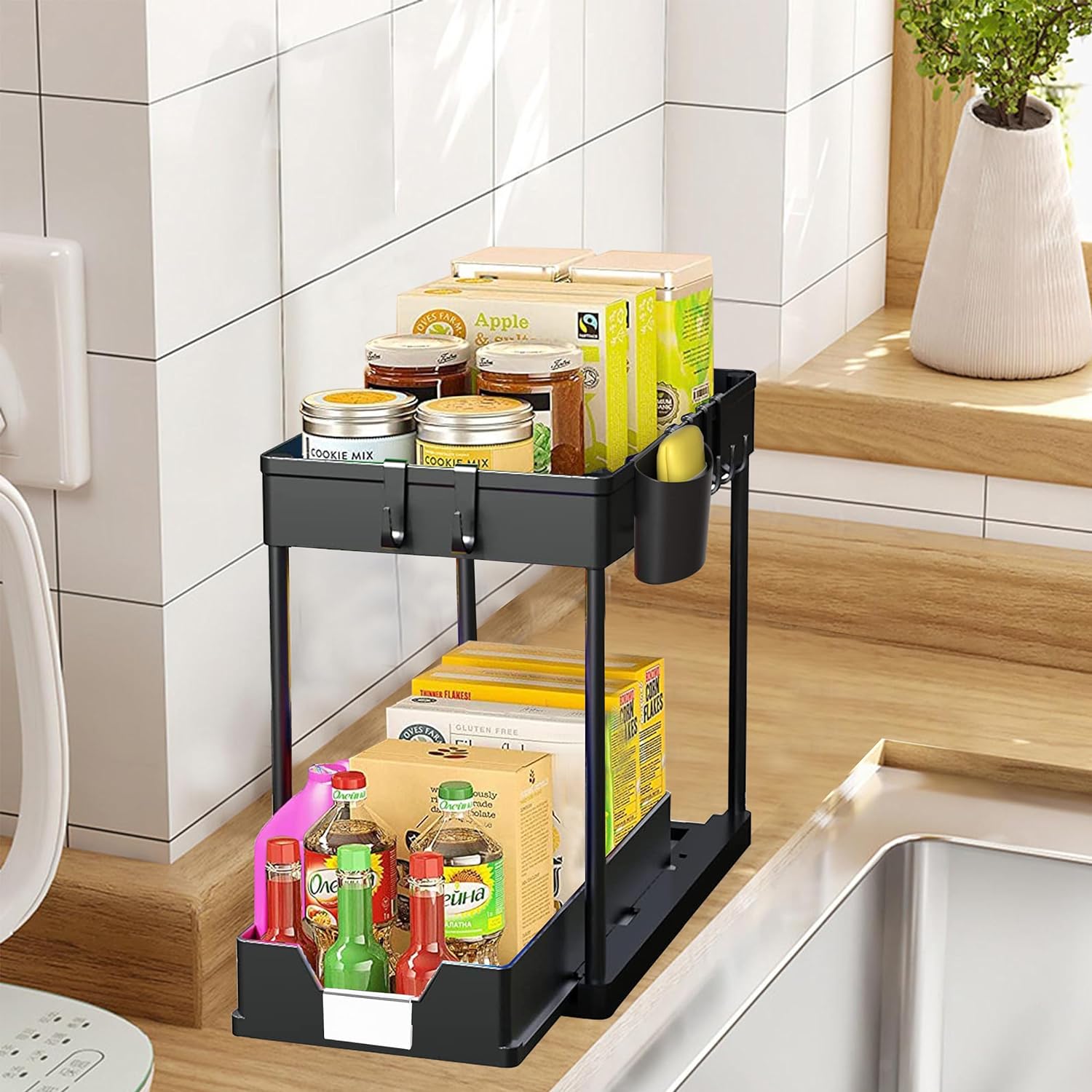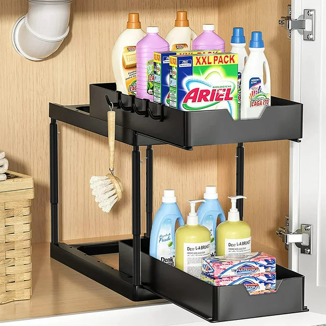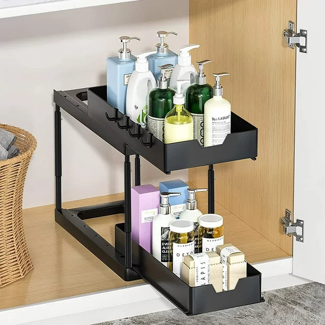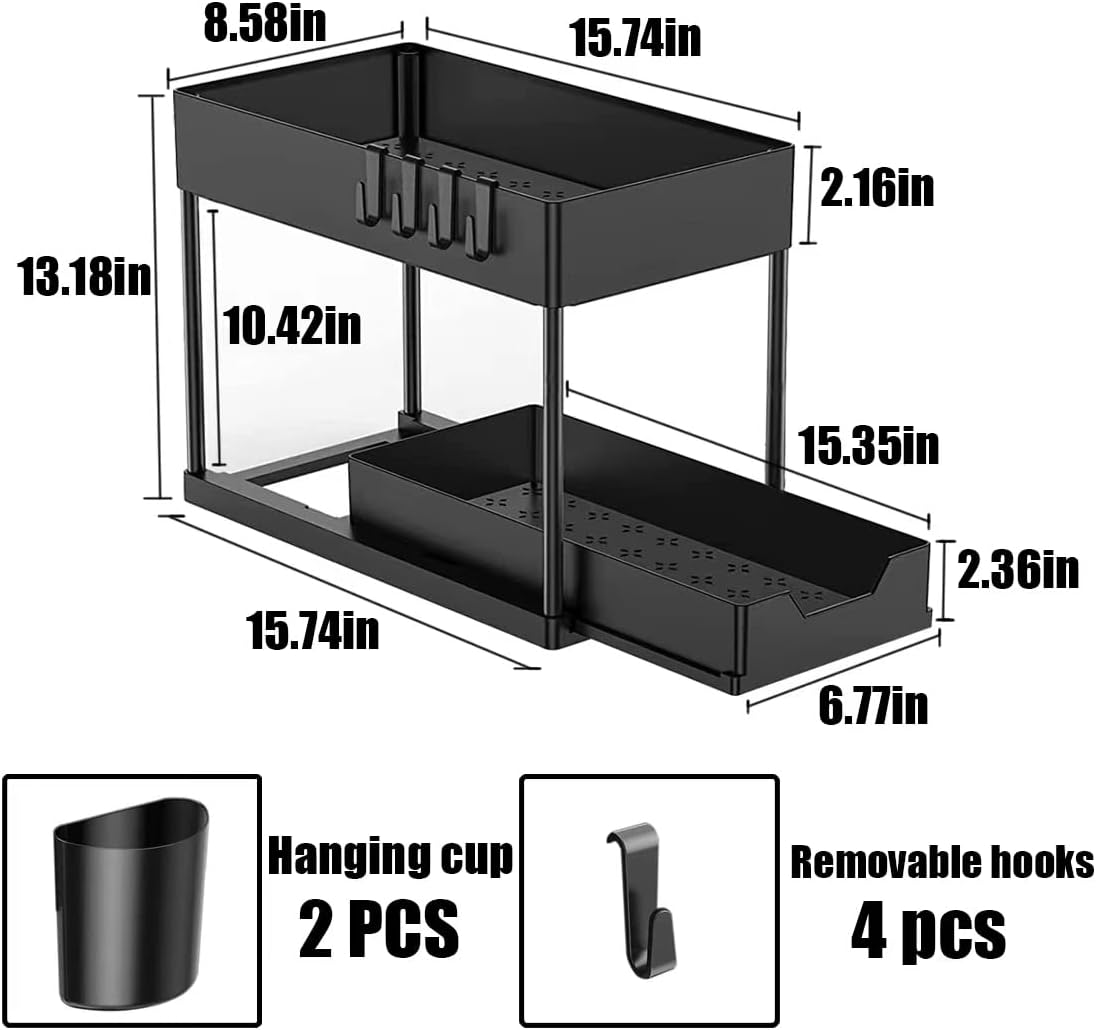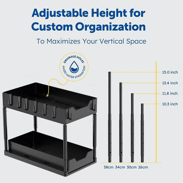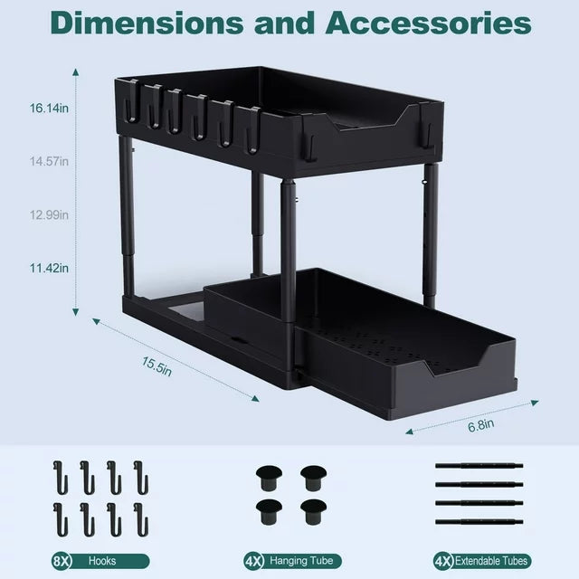 [Multifunctional] Organizatorul de sub chiuveta pentru baie nu poate fi folosit doar sub chiuveta din baie sau bucatarie, ci si pe birou ca suport pentru condimente de bucatarie, pentru a tine cereale, conserve, sare, sau ca tava pentru prosoape, sapun, sampon si altele.
