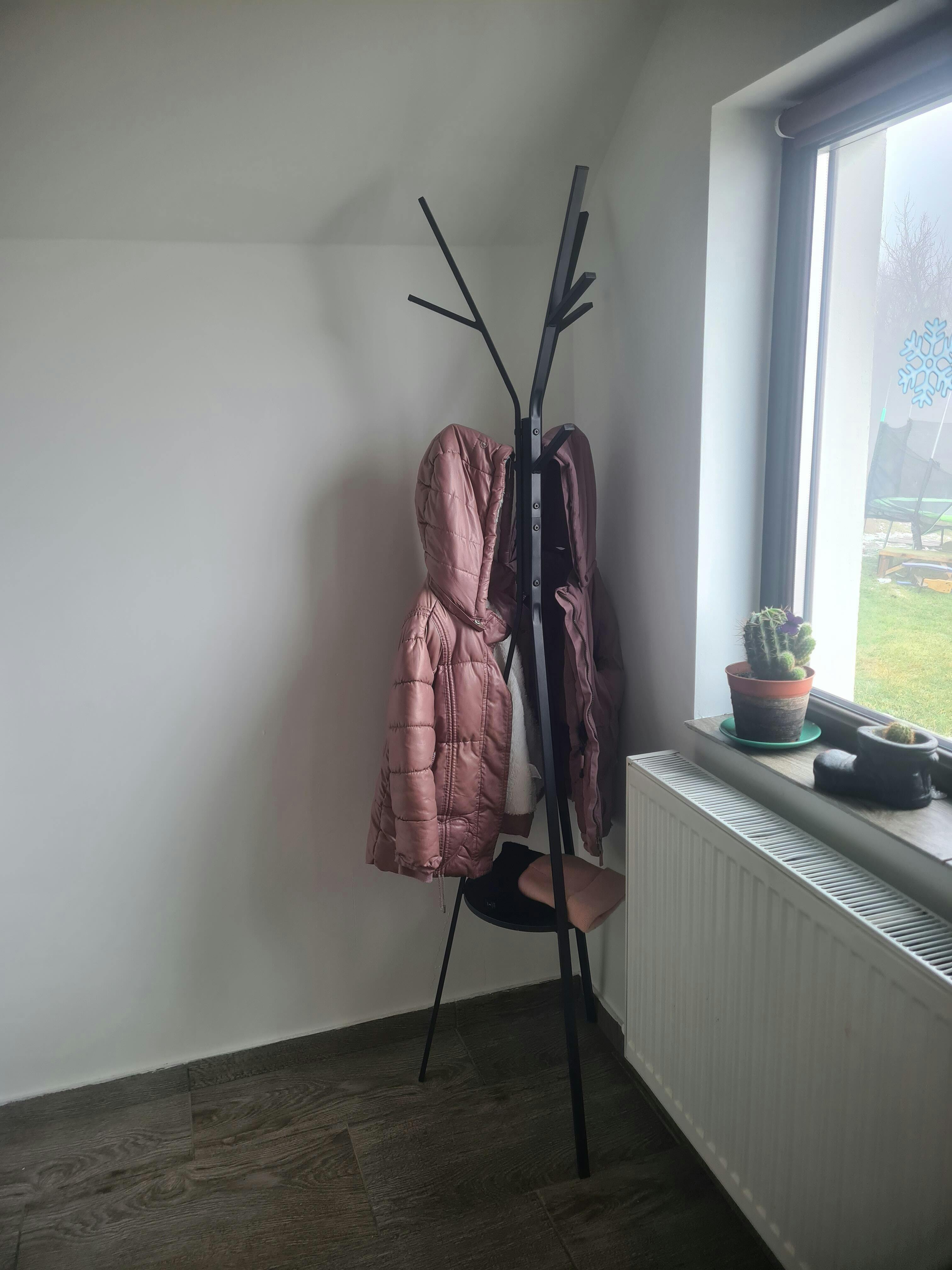 SUPORT ECONOMISITOR DE SPATIU PENTRU HAINE SI PALARII - Ocupa putin spatiu pe podea, avand dimensiunile de 45 x 45 x 180 cm (L x l x H). Ideal pentru hol, intrare sau colturi. Designul elegant si simplu in forma de ramura este functional si artistic, oferind un plus decorativ in camera