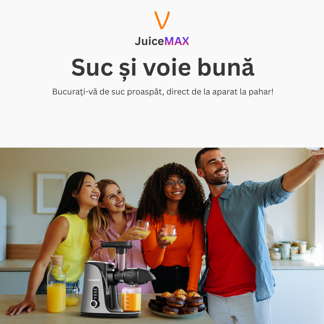 JuiceMAX storcator • Storcator presare la rece • Slow juicer • Cold press juicer • Storcator masticating • Storcator fructe si legume • Storcator silentios • Storcator profesional • Slow juicer inox • Storcator cu melc • Storcator suc verde