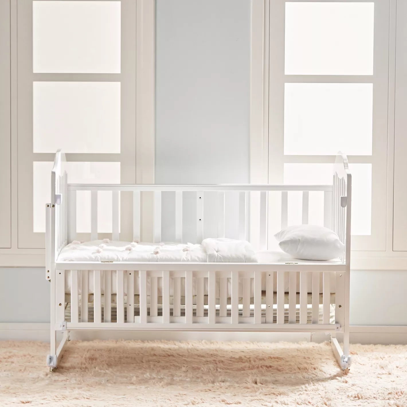 Rotilele pivotante la 360° sunt silentioase, usor de manevrat si prevazute cu frane pentru stabilitate maxima. Patutul se poate extinde prin deschiderea placii frontale, oferind mai mult spatiu copilului pe masura ce creste.