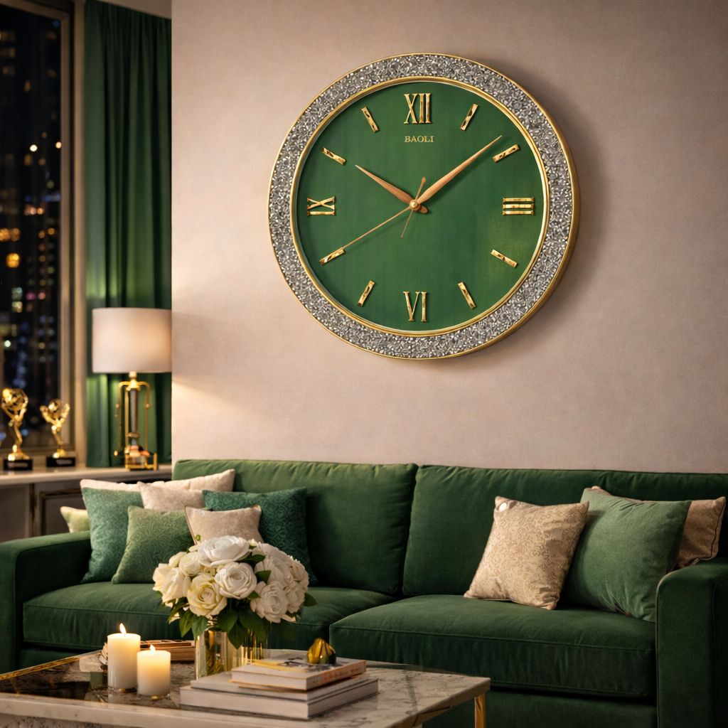 Rama decorata cu elemente stralucitoare creeaza un efect vizual deosebit, transformand ceasul intr-un adevarat element de decor, nu doar intr-un obiect functional. Designul sau echilibrat il face ideal pentru living, dormitor, birou, hol sau spatii elegante.