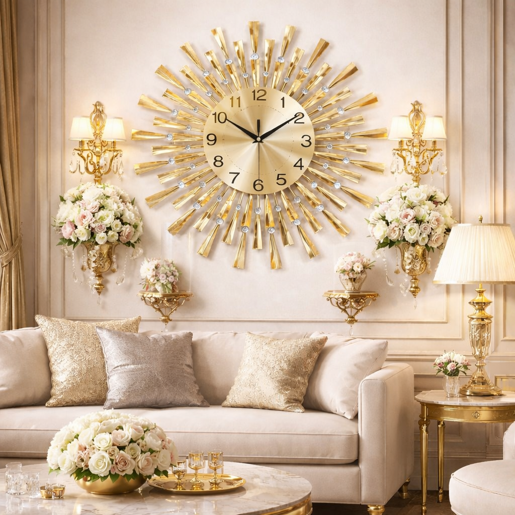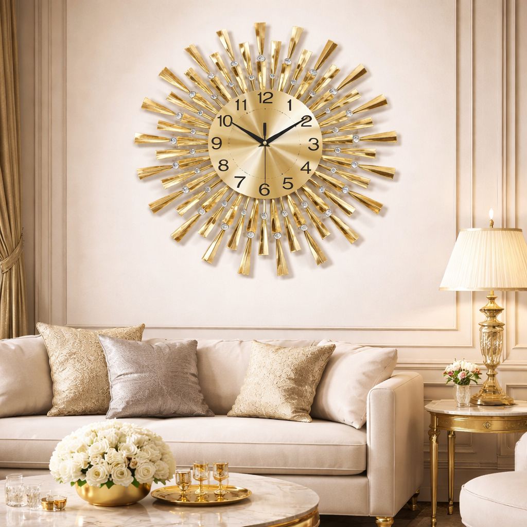 Ceas de perete decorativ tip soare, o piesa statement care imbina functionalitatea cu un design spectaculos, ideal pentru living, dormitor, hol sau birou. Modelul impresioneaza prin structura radianta, cu elemente metalice dispuse circular si accente stralucitoare care adauga eleganta si rafinament spatiului.