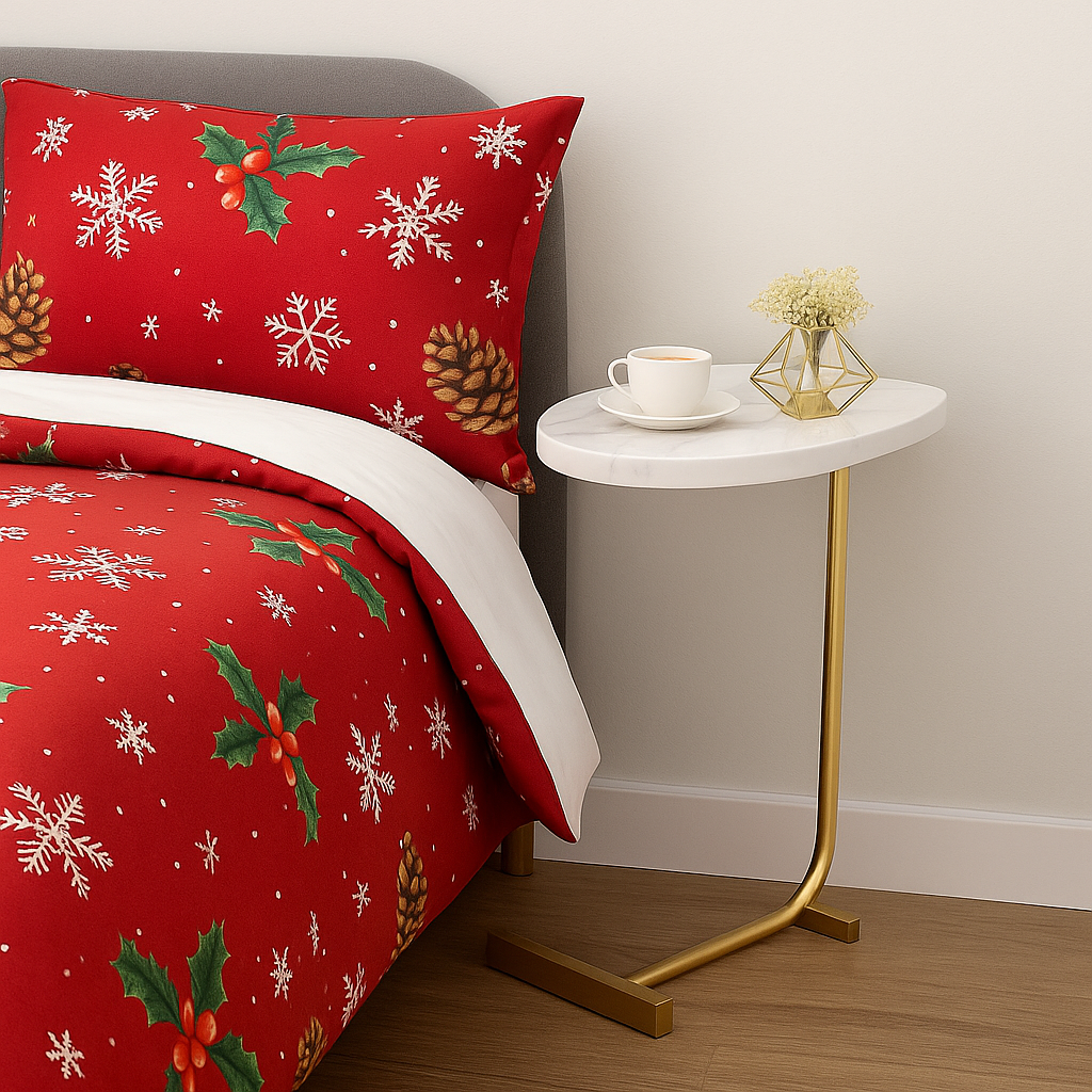 Forma compacta si liniile curate fac ca masuta sa fie ideala langa canapea, pat sau fotoliu, oferind un spatiu practic pentru telefon, bauturi, carti, laptop sau decoratiuni. Blatul rotunjit cu aspect de marmura transforma masuta intr-o piesa statement, perfecta pentru interioare moderne si sofisticate.