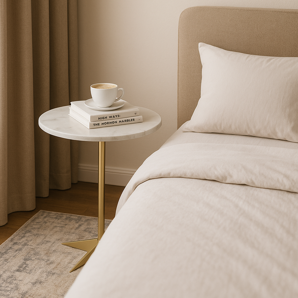 Blatul rotund de 40 cm asigura spatiu optim pentru utilizarea zilnica, iar piciorul metalic rezistent, sustinut de o baza solida de 37 x 30 cm, ofera stabilitate excelenta. Inaltimea de 50 cm o face ideala ca masuta de canapea, masuta laterala, masuta de pat sau suport pentru decor.