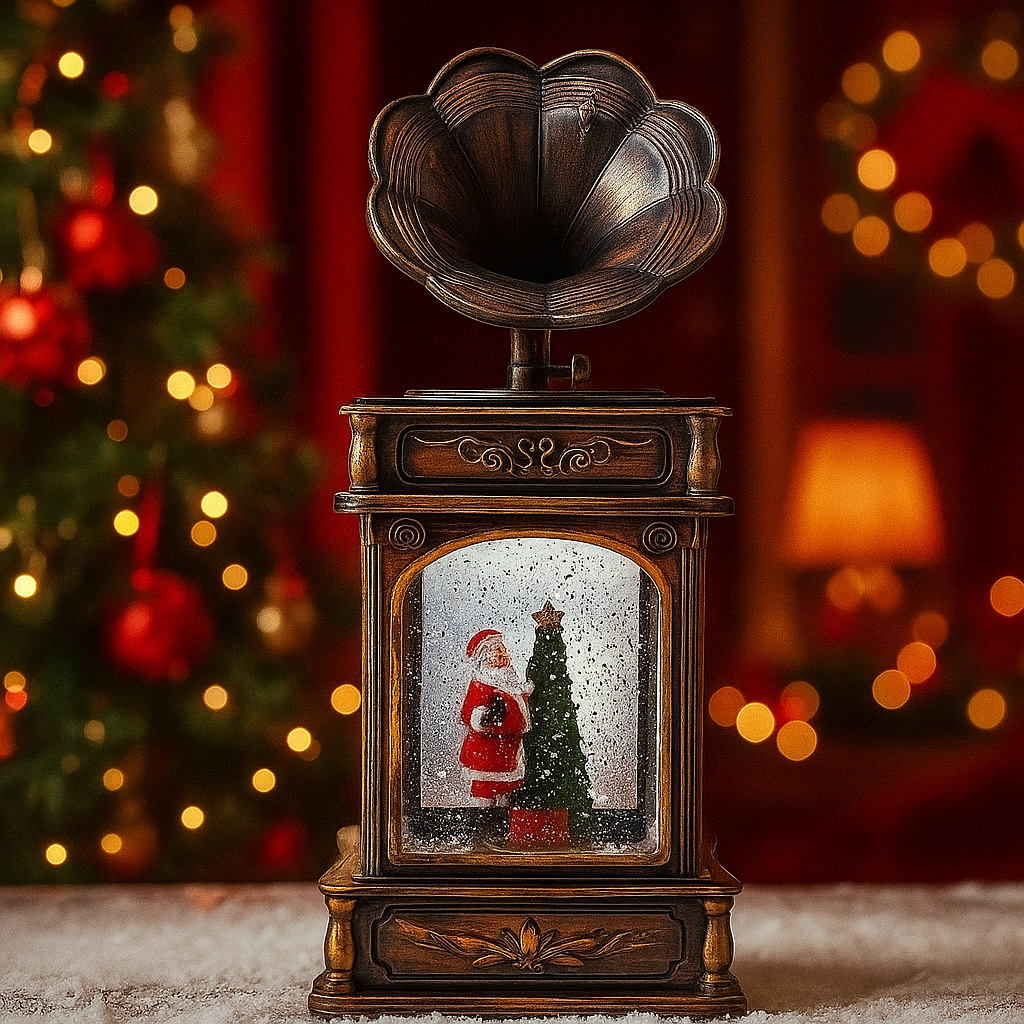 Acest gramofon decorativ cu efect de ninsoare si functie muzicala combina traditia, eleganta si magia sarbatorilor intr-un singur obiect rafinat.