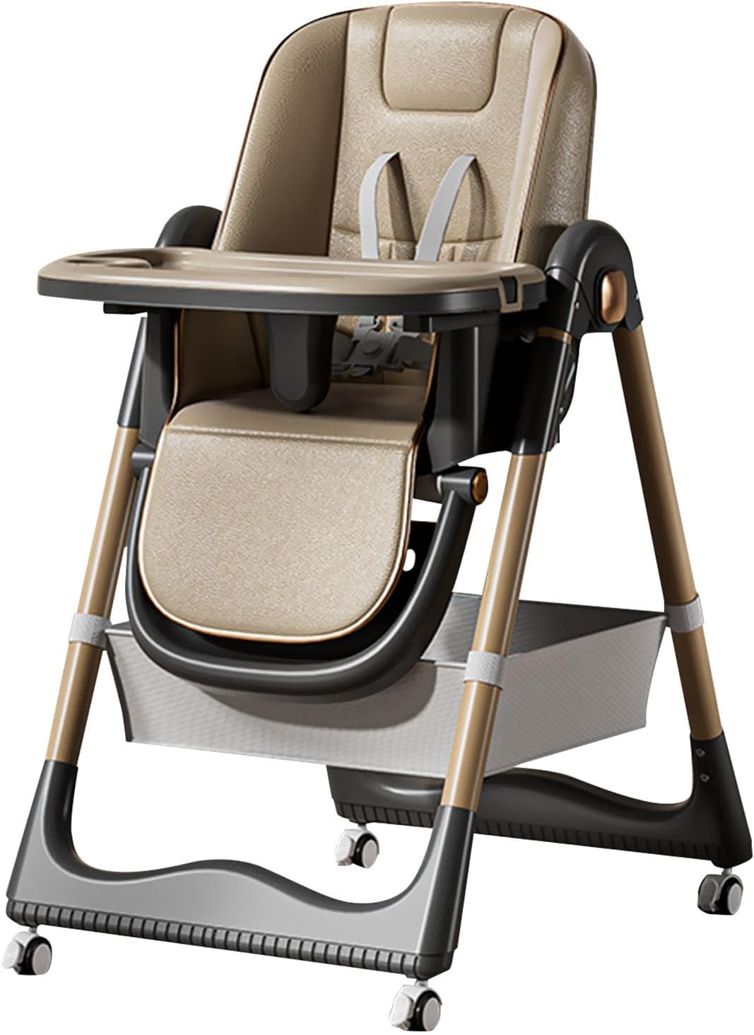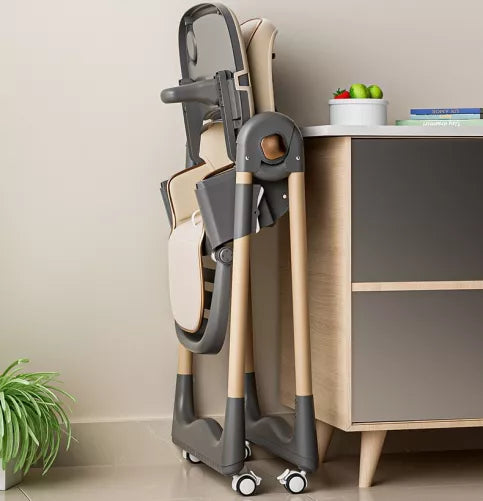 Scaun de masa pliabil pentru bebelusi reglabil pe inaltime si inclinare, cu centura de siguranta si tava detasabila – maro